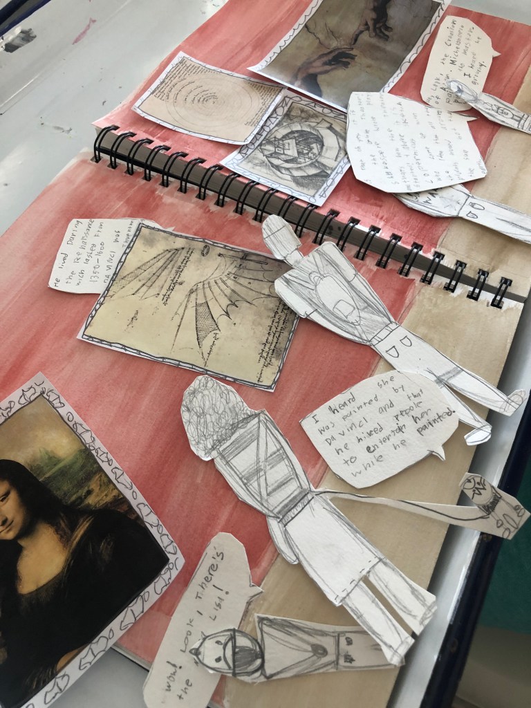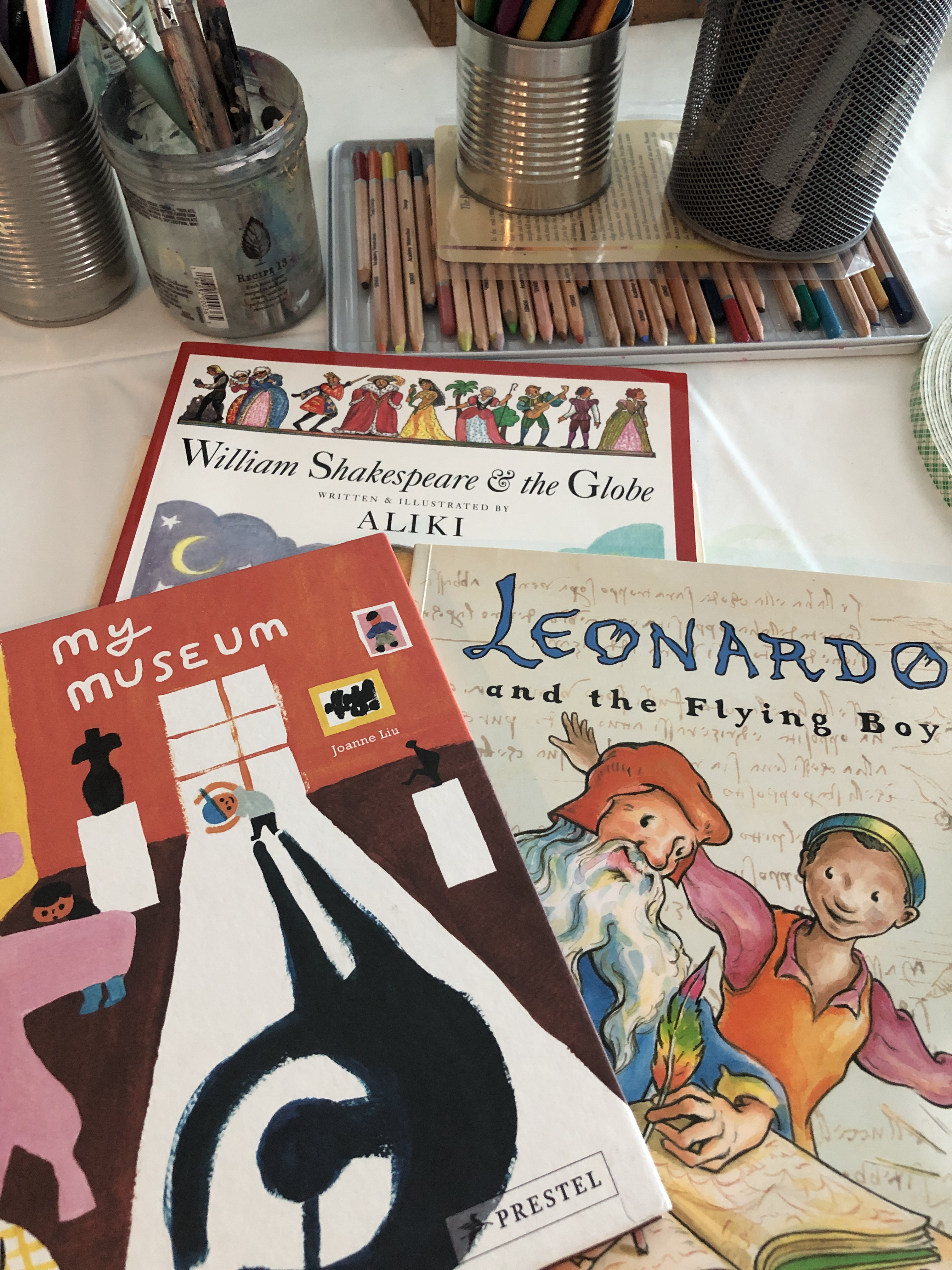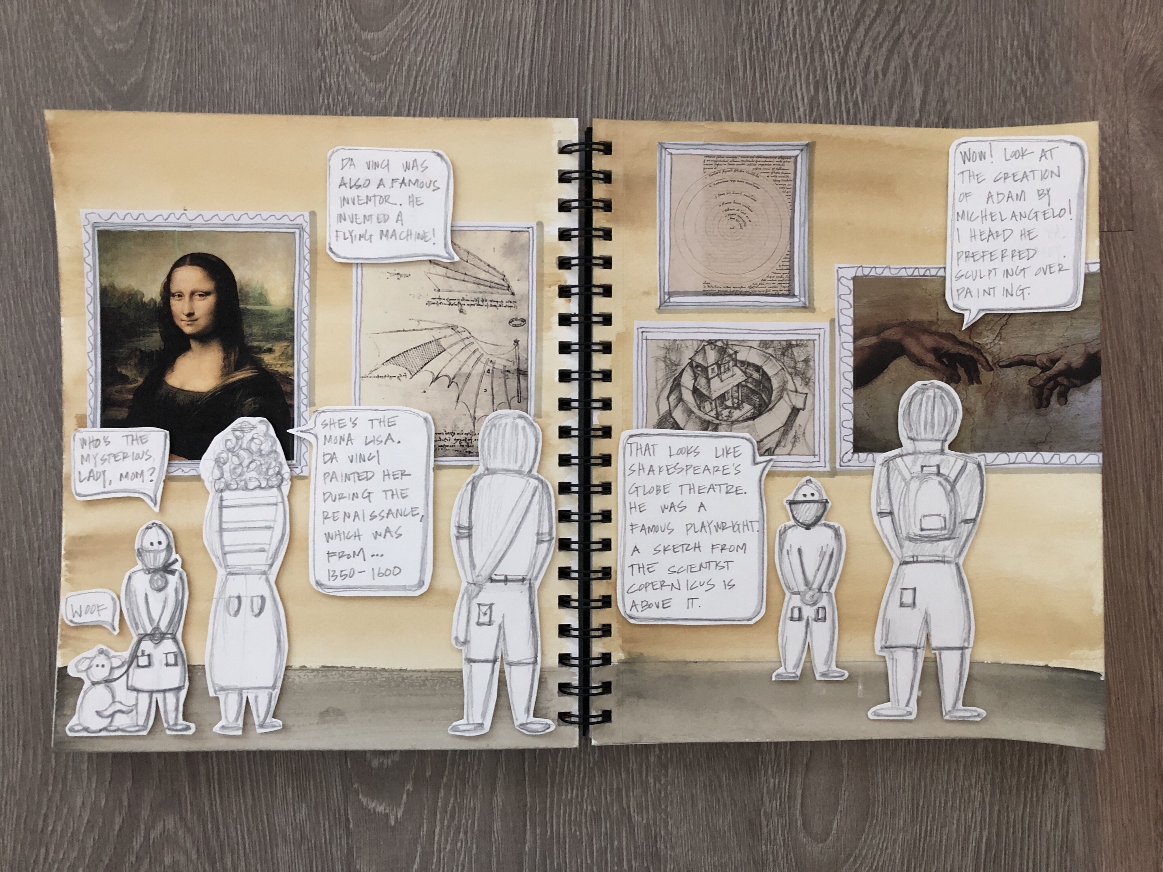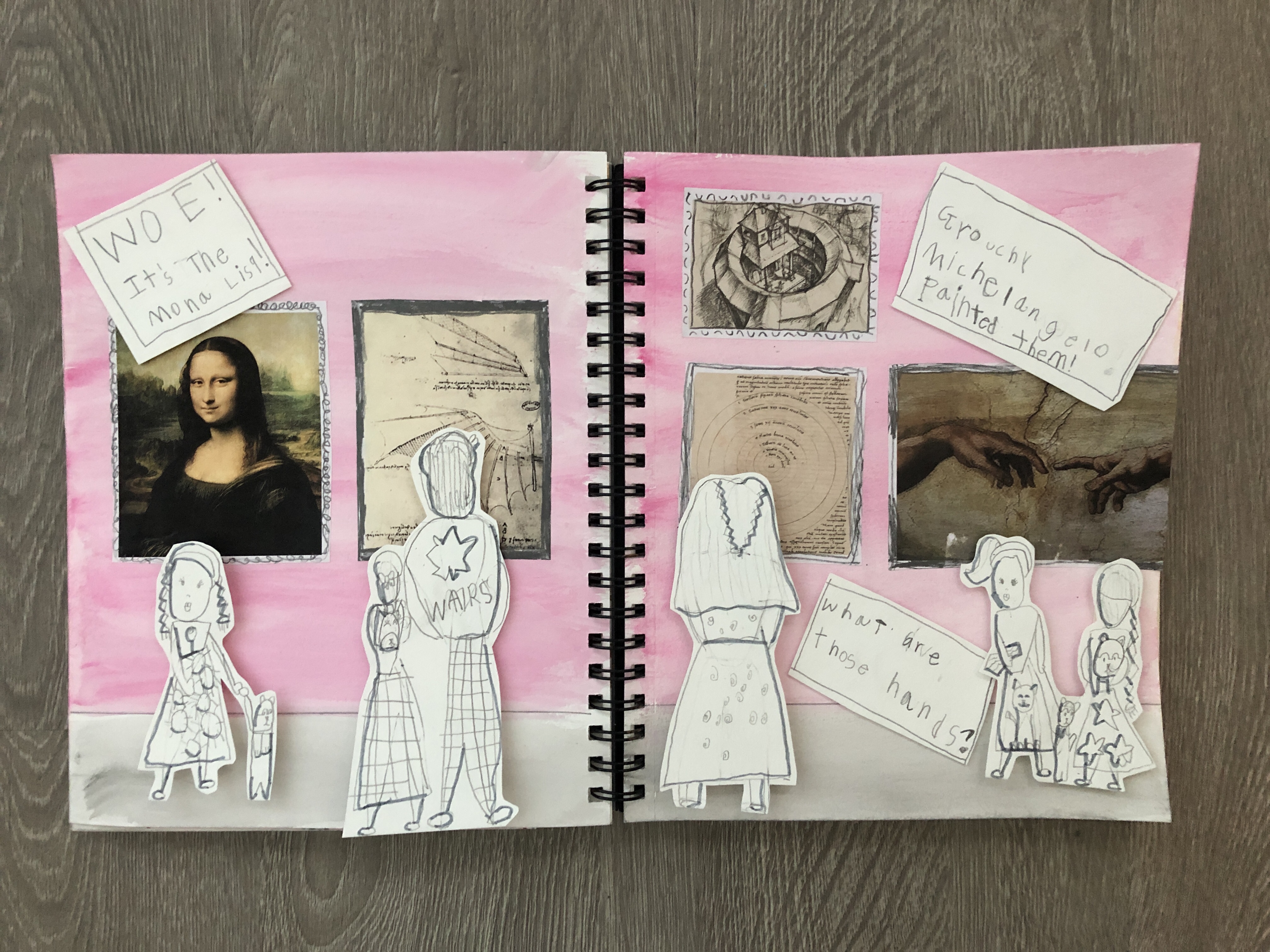 …..i was the most excited about the opportunities for this sketchbook page, but when it came down to designing it i really struggled because i found my drawings didn’t capture what i wanted the kids to see in leonardo da vinci’s amazing sketches …. that’s when this fun little children’s book without any words inspired me to design a gallery for the maters’ art…. this way our students can really examine renaissance art. we had a great time talking about things we knew about the masters for our stories and creating our gallery scene. I hope your families have a fun time with this!
