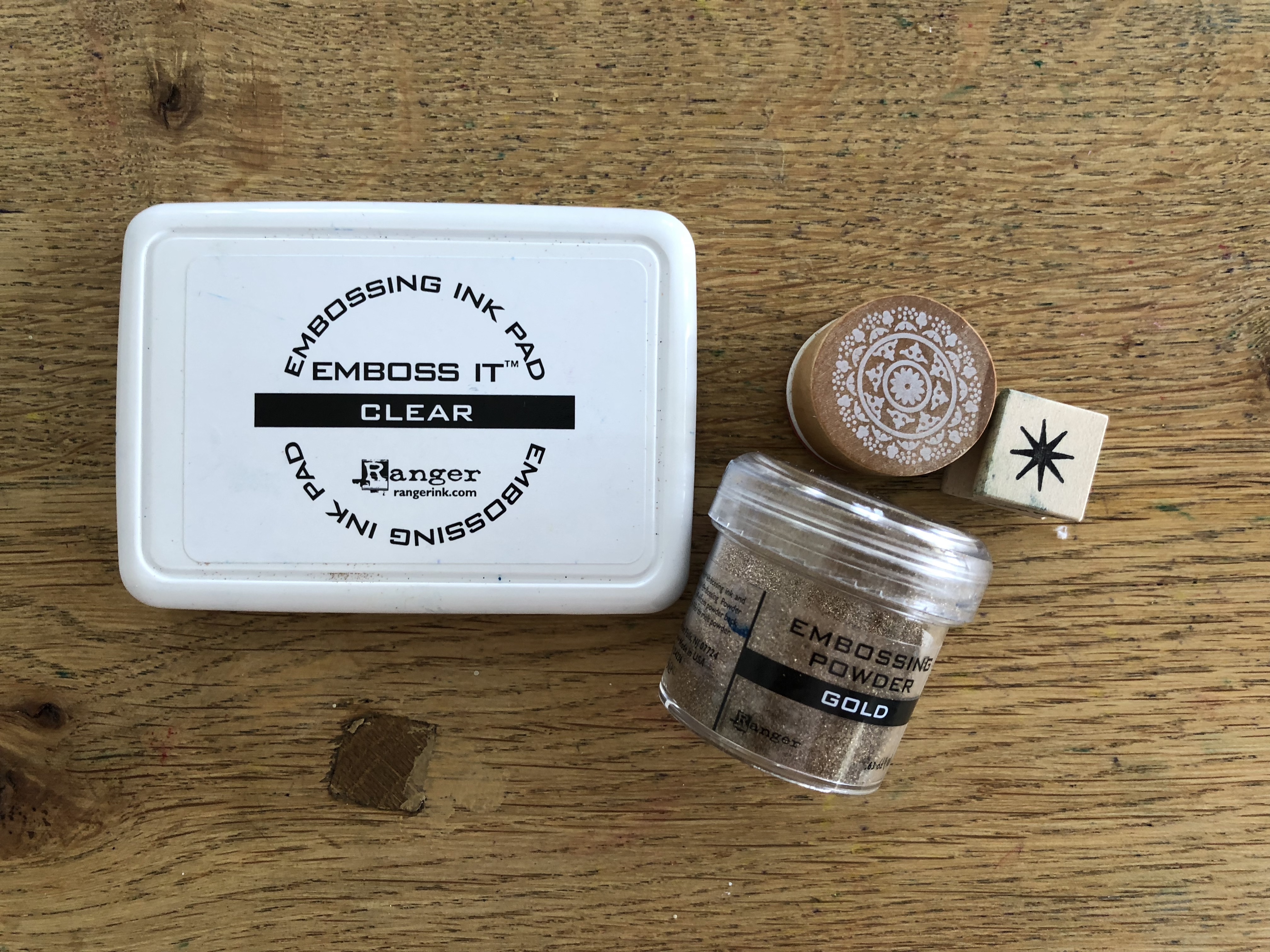 - Gold embossing powder (a little goes a long way + be sure to reuse dusted off powder)