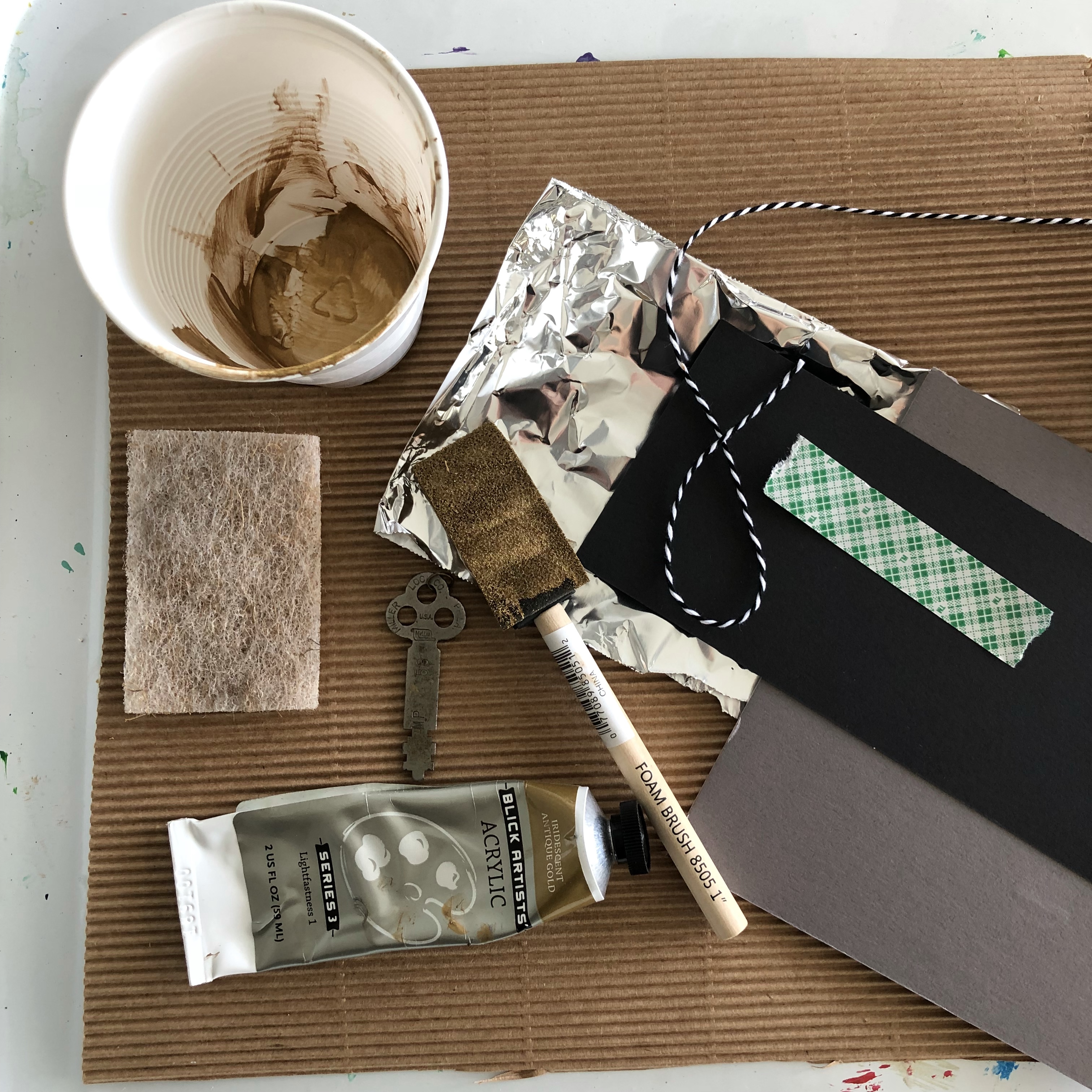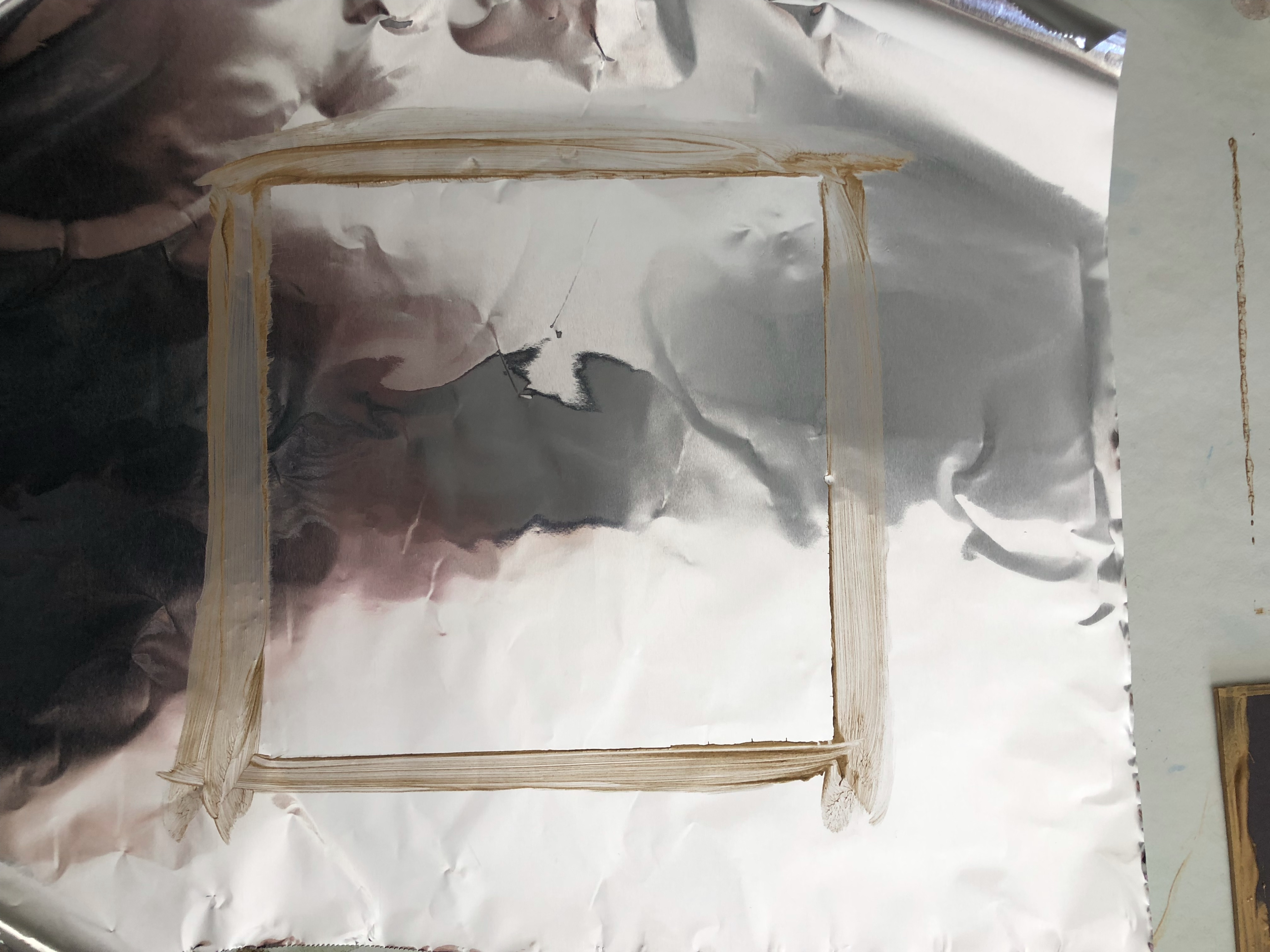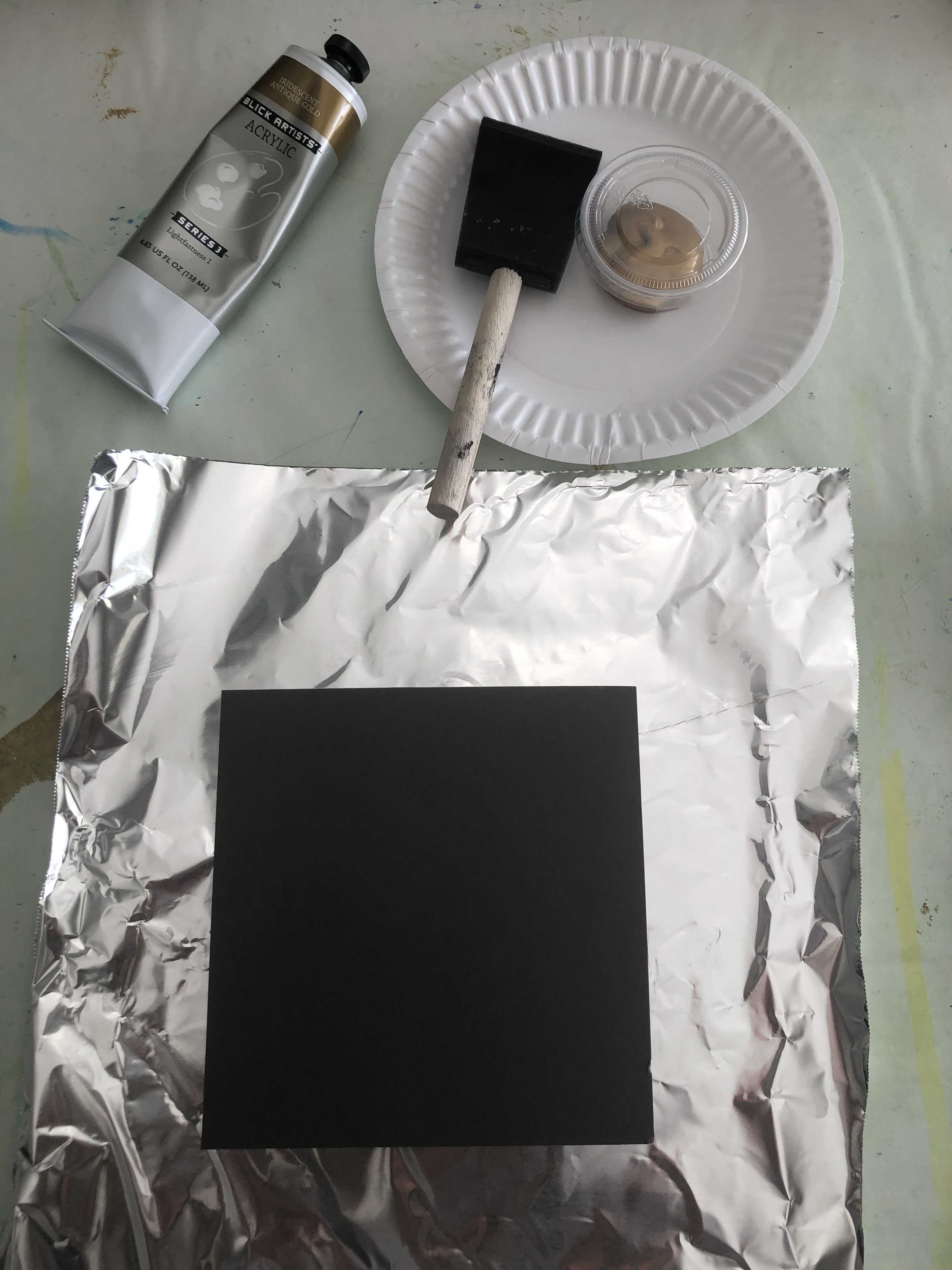 - With a foam paintbrush paint shiny side of foil with a very thin layer of gold acrylic paint