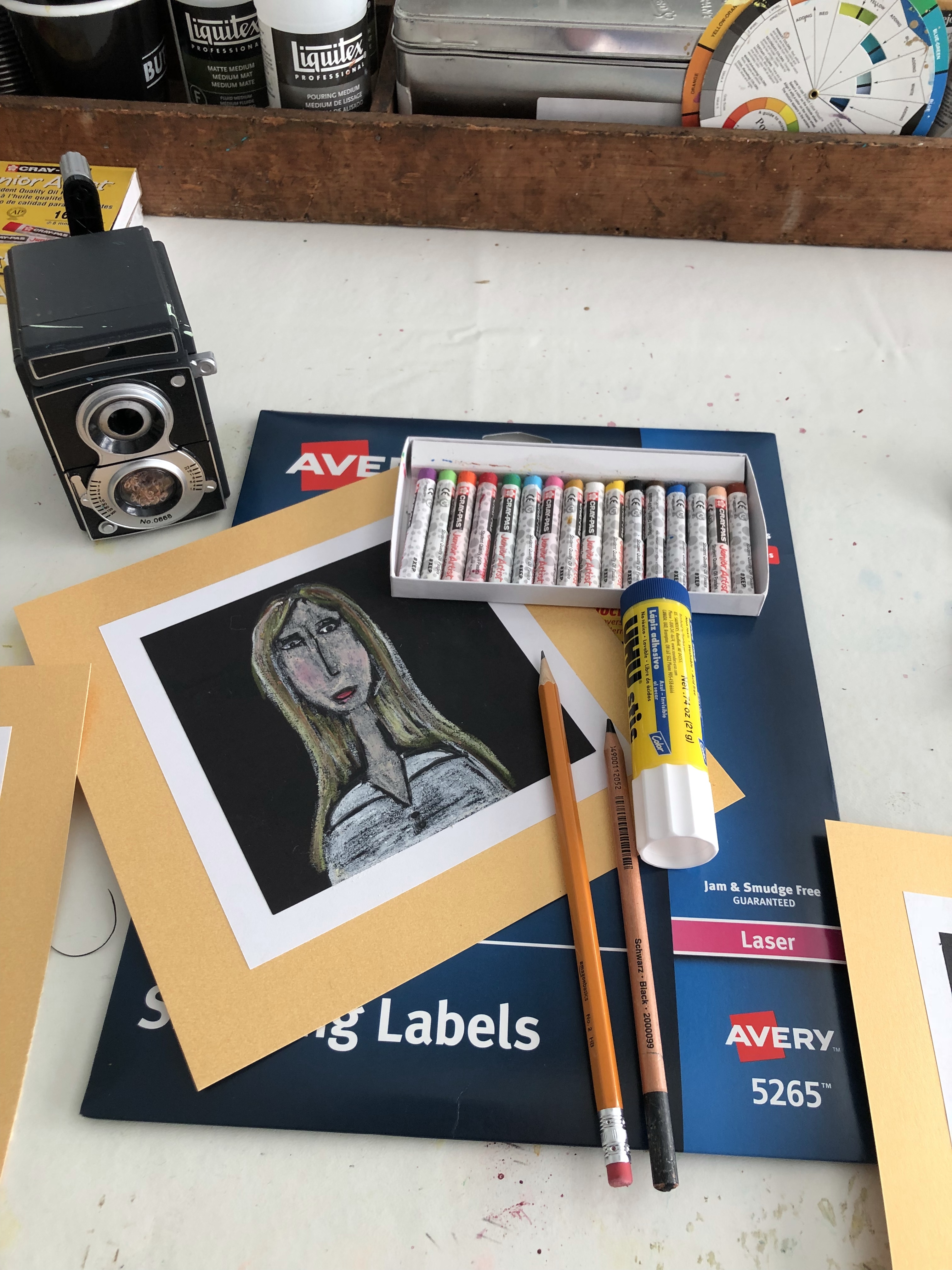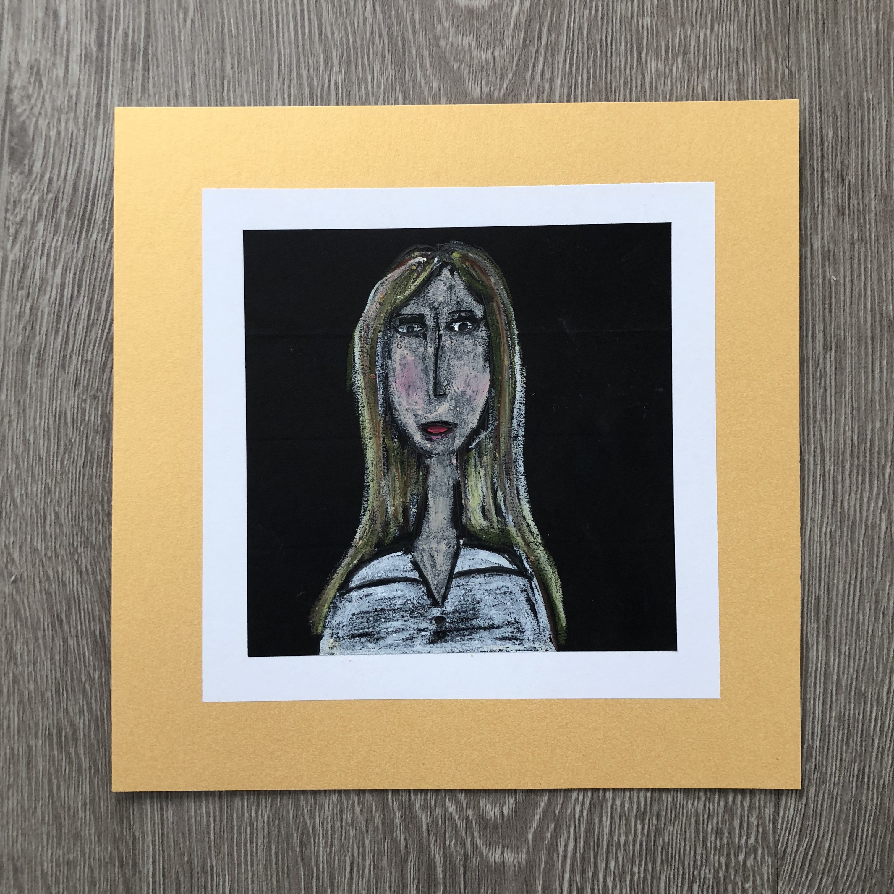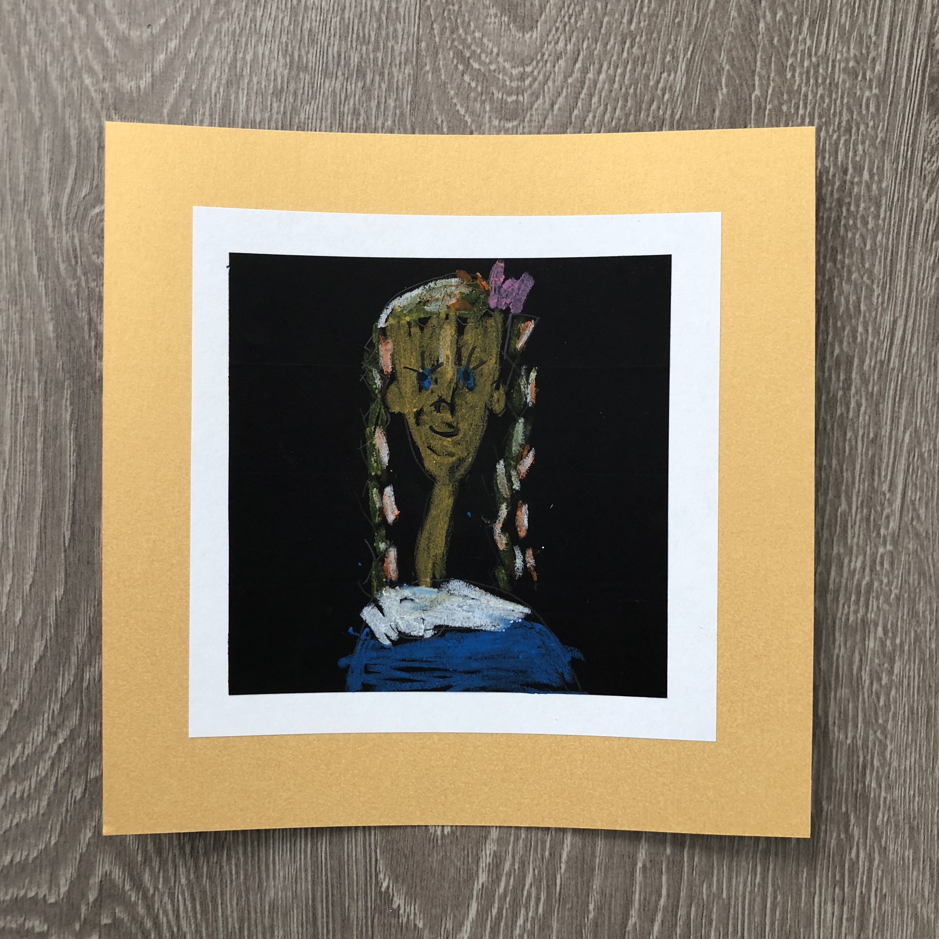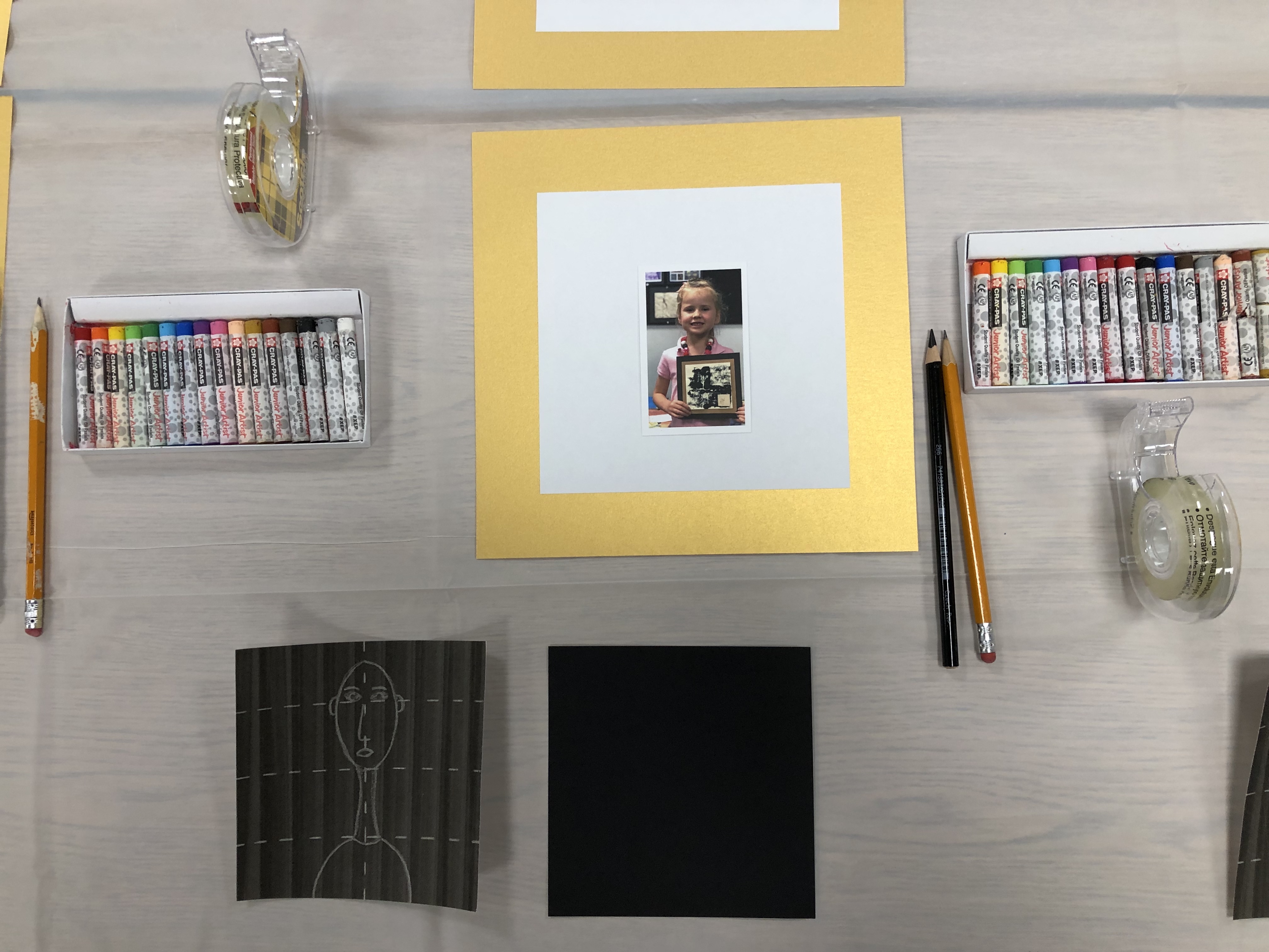 - With glue stick or double face tape adhere portrait to white paper and gold cardstock “frame”