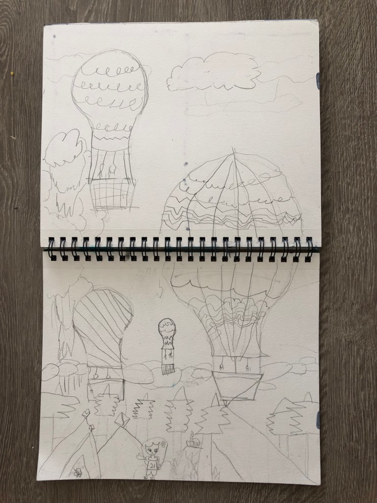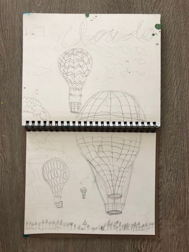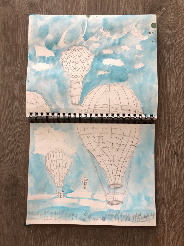 - draw hot air balloons and clouds in pencil