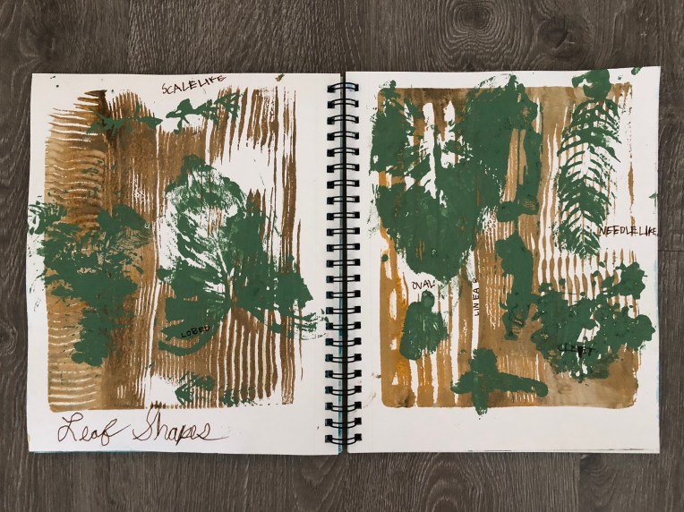 cc cycle 1.week10.science.leaf shapes PRINT MAKING WITH LEAVES gelli mat [follow instructions that come with the mat]print making roller print making tools gold and green paint brush marker washi tape Related