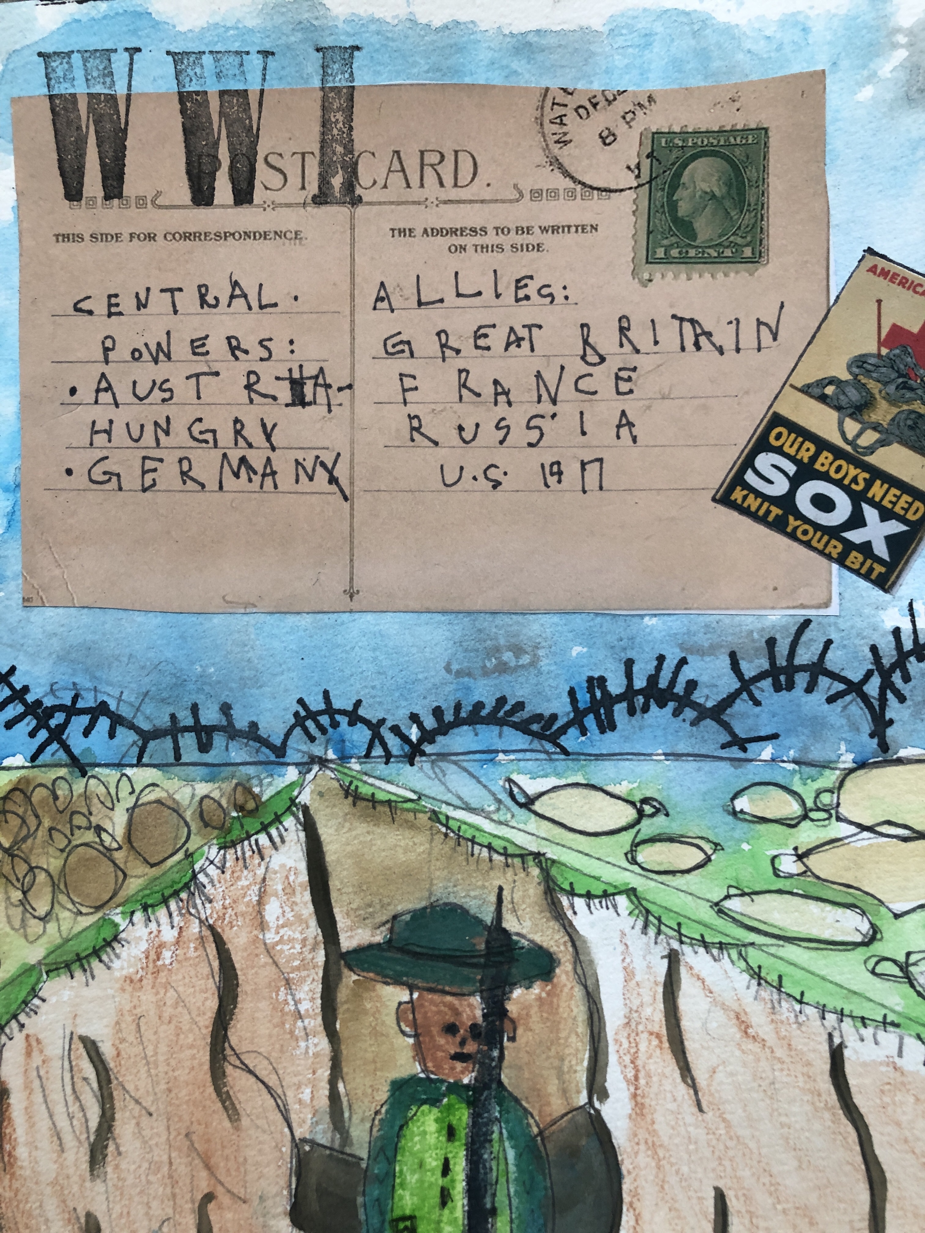 - print out WWI postcard (image of an actual postcard from WWI …. I used photoshop to remove the text so we could write our history info on it)