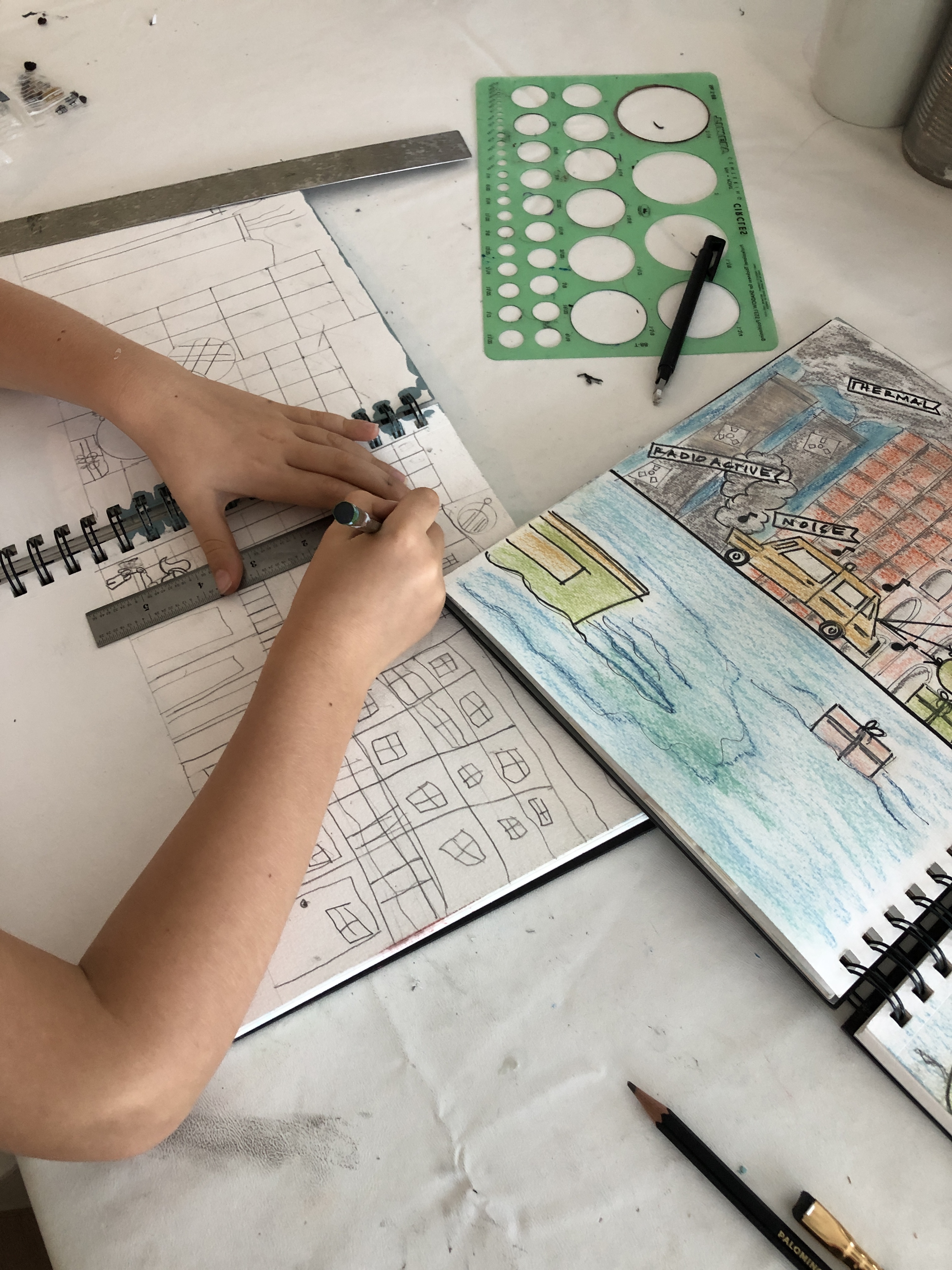 - the buildings in the background should be traced in a thin pen whereas the car and drawings in the foreground should be traced in a thicker pen.