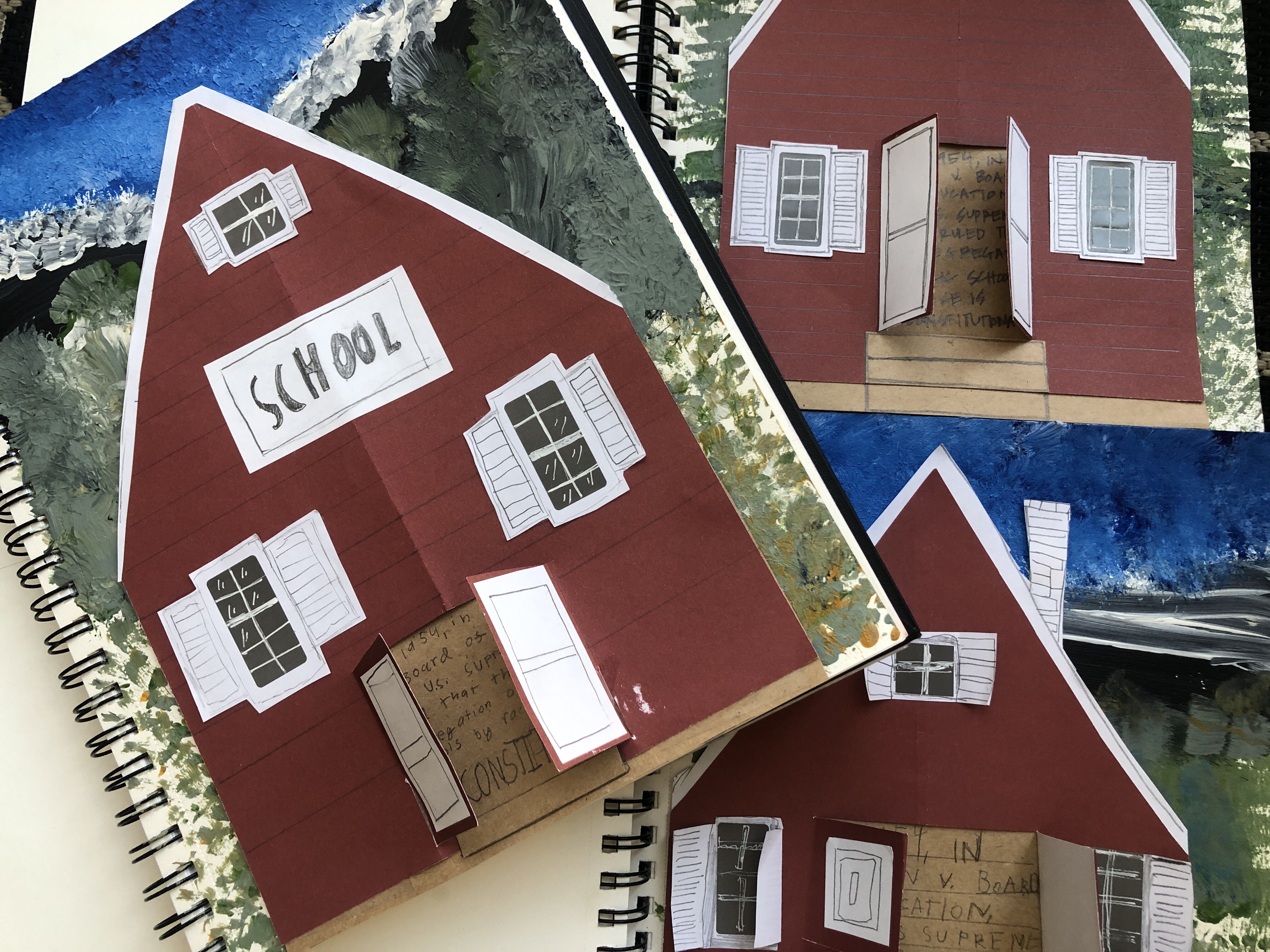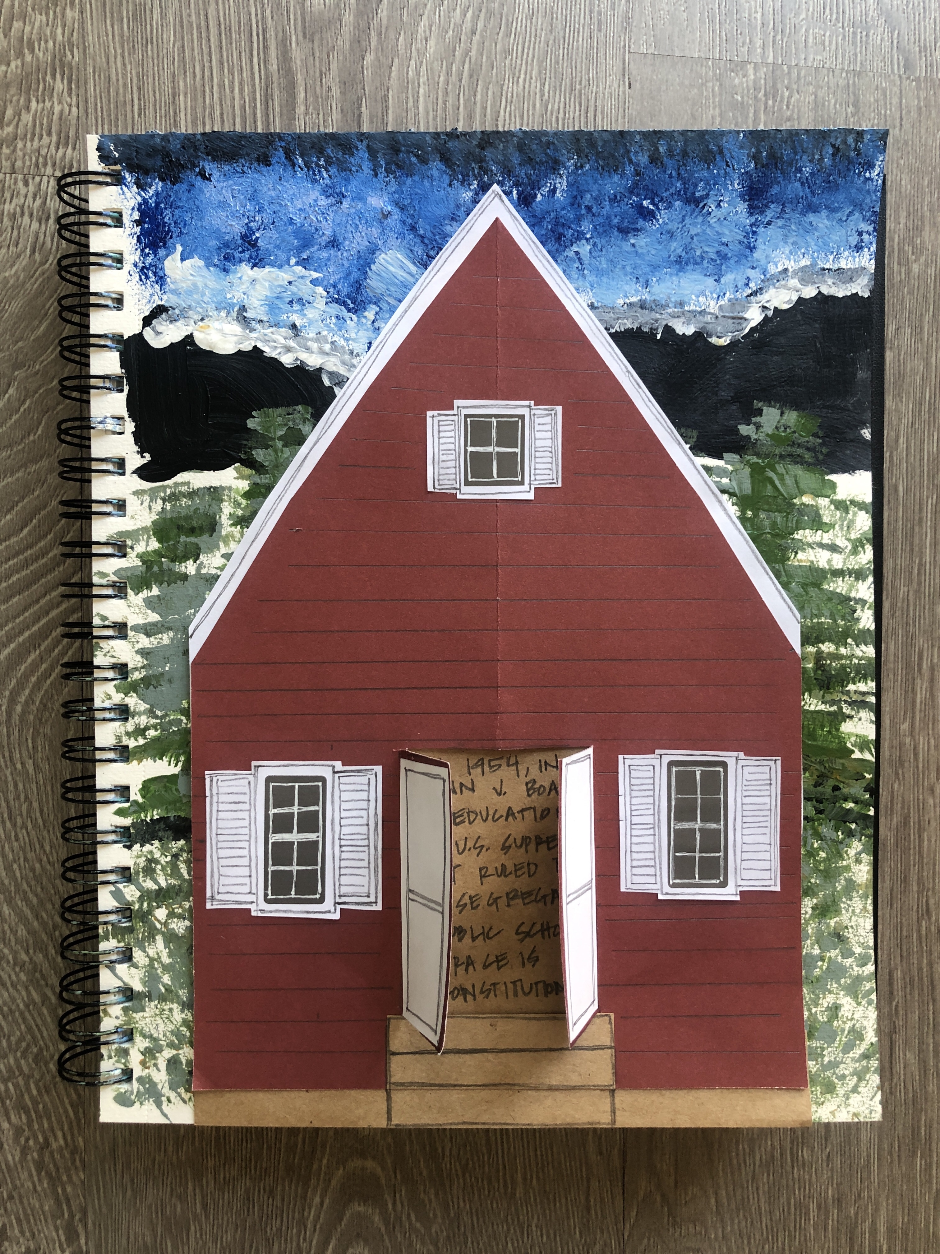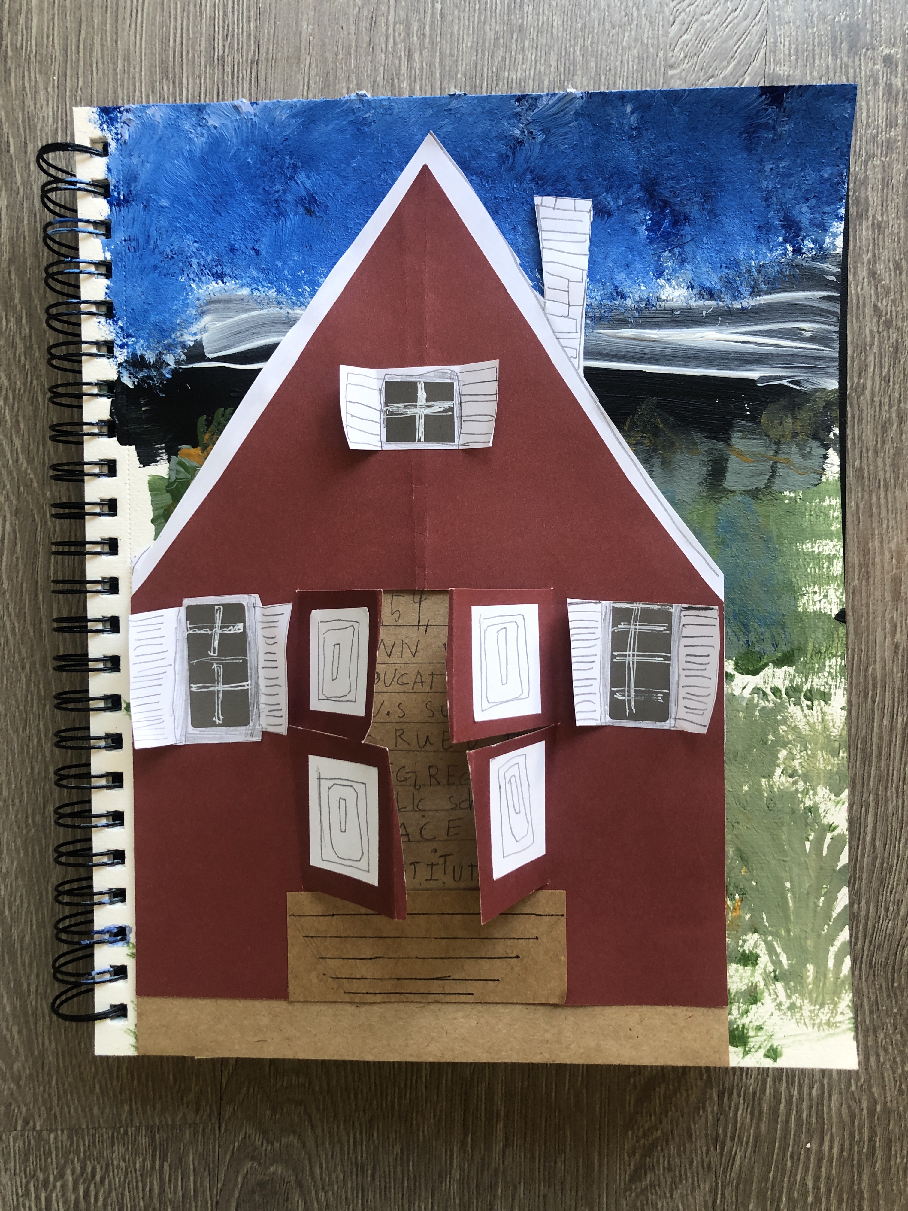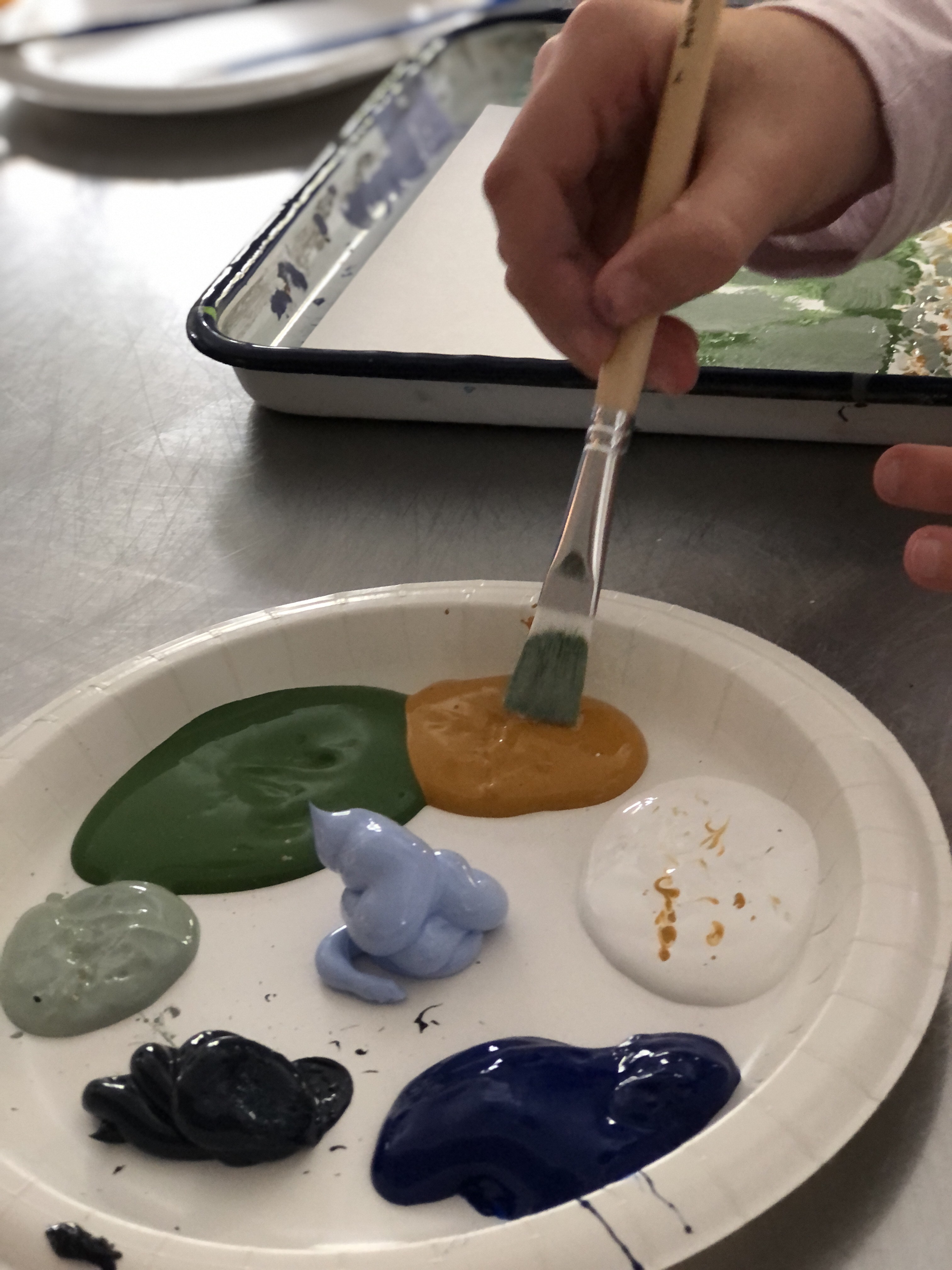 - acrylic paint or tempera paint [blue, white, gray, olive, sage, periwinkle, mustard] note: all colors can be made from primary colors …. do a little web search for the color mixing combo