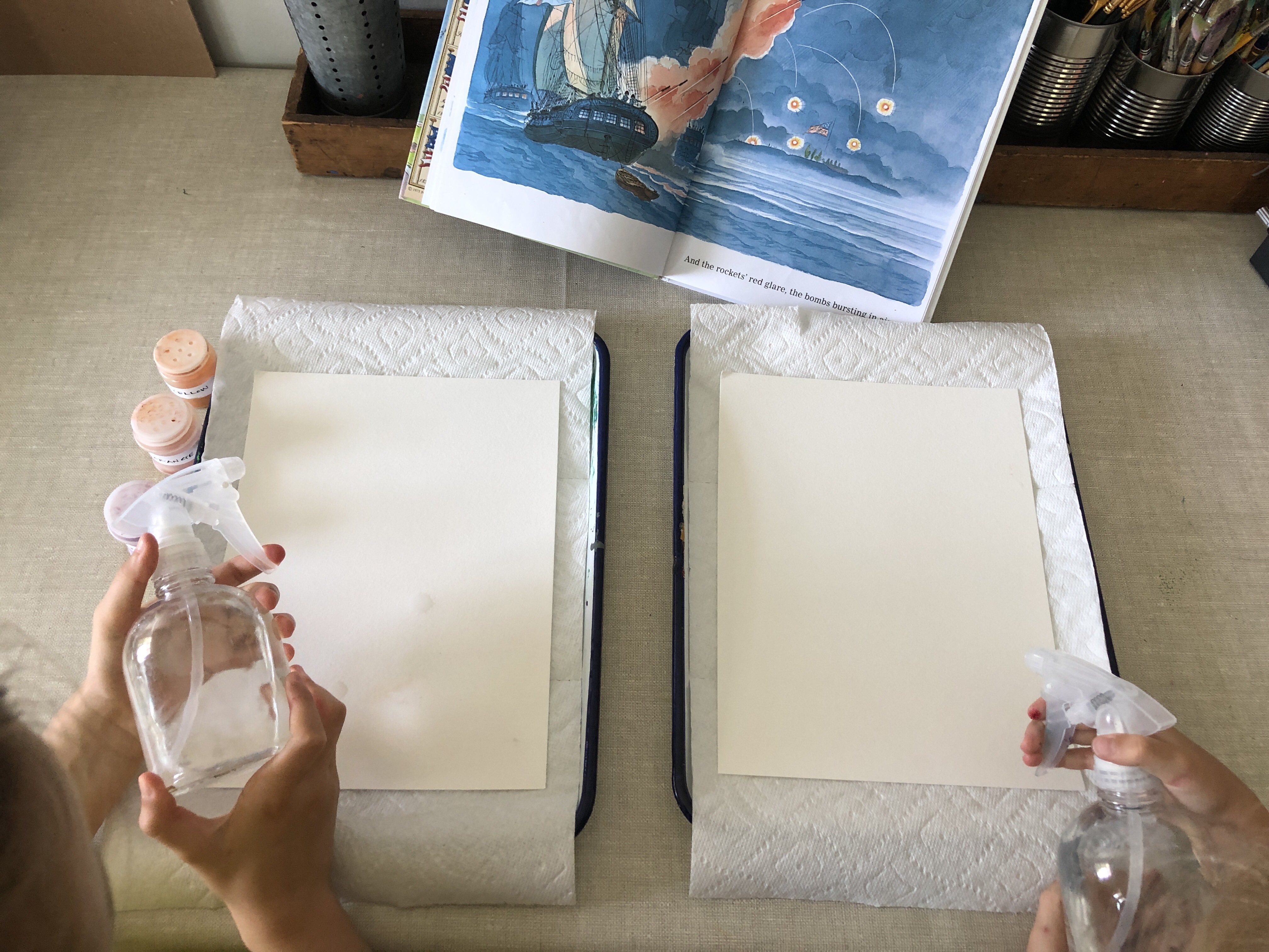 - crimson, orange, yellow watercolor crystals, spice containers to shake crystals, spray bottle filled with water